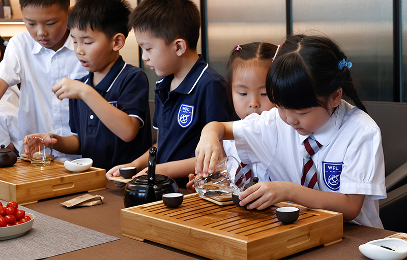 审评老师带领孩子们体验专业的茶叶审评流程,直观地感受不同茶类的色、香、味、形。随后在茶艺老师的引导下,孩子们自己上手,认真、专注地学习泡茶,老师们也喝上了学生亲手泡的茶。